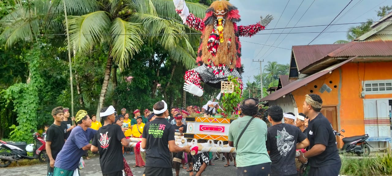 PASARWAJO-TERASNUSANTARA_Umat Hindu di Desa Ambuau Indah dan Desa Siomanuru, Kecamatan Lasalimu Selatan menggelar pawai ogoh-ogoh sebagai rangkaian menyambut Hari Raya Nyepi. Patung raksasa yang identik dengan wajah menyeramkan itu diusung beramai-ramai, menjadi simbol “pengusiran” sifat buruk dan energi negatif dalam diri manusia.